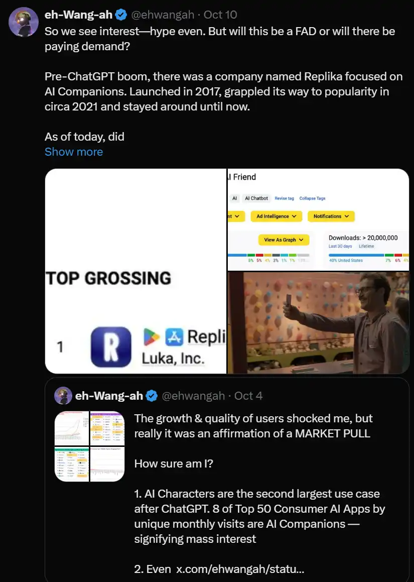 然而,并不仅仅是科技巨头愿意为某个专家投入巨资,市场对 AI 虚拟伴侣的需求也在迅速增长。
