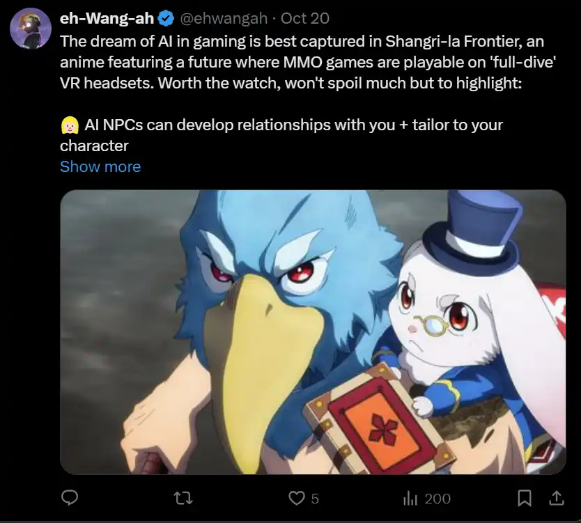 你可以娶 NPC,重启故事,成为你想成为的人,享受一种无边界的第二人生。这就是把「她」(HER)变为现实。这是《刀剑神域》(Sword Art Online)。这是《一级玩家》(Ready Player One)。这是数字版的曼谷(Digital Bangkok)。如果你仍然无法理解——去看看动漫《香格里拉边境》(Shangri-La Frontier)。