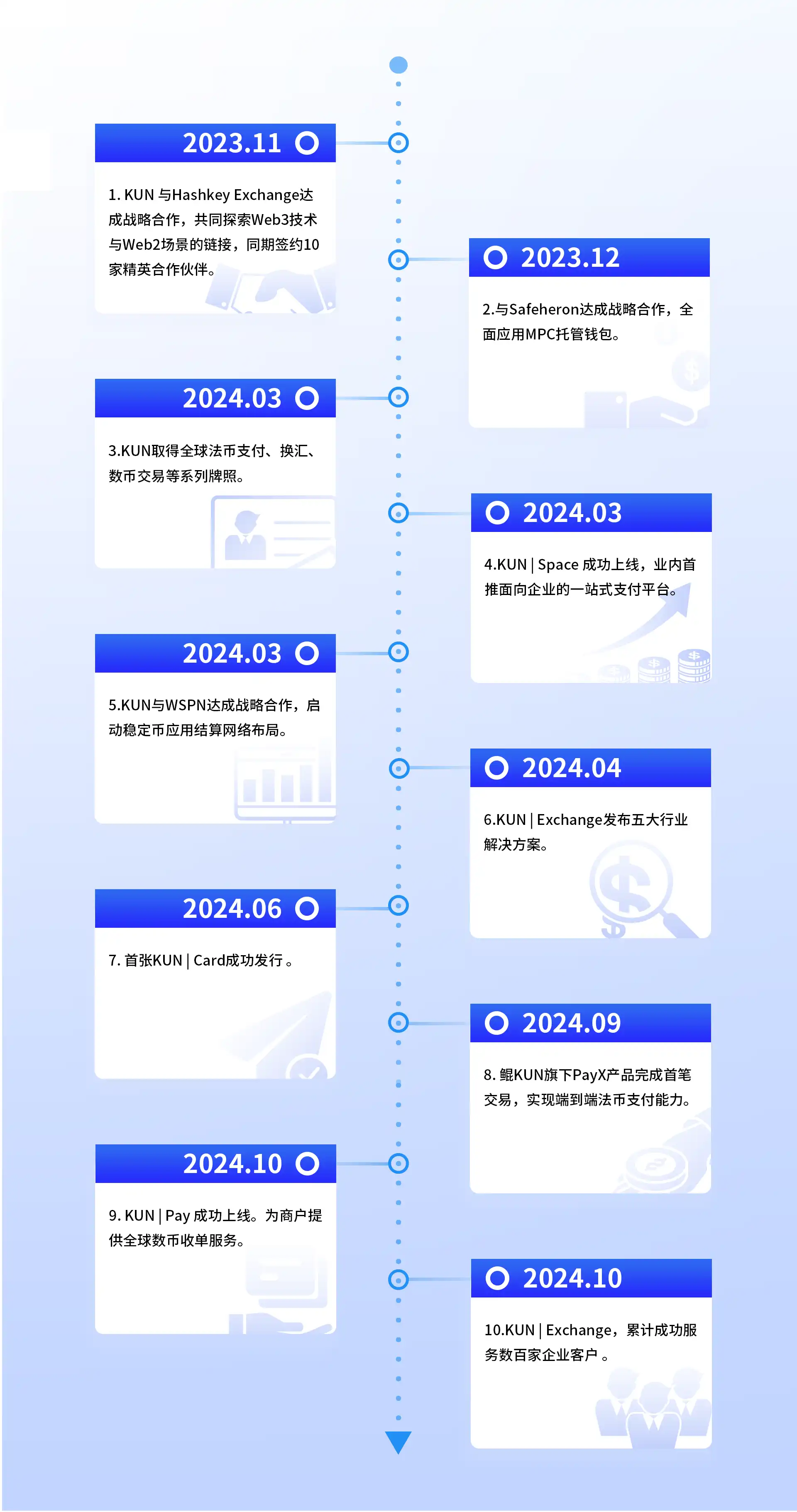 自 2023 年 10 月 27 日成立以来,鲲 KUN 作为首个成功定义可信 Web2 Web3 一站式支付的全球化数字支付服务商,立足场景,先后推出出海服务、跨境贸易、Web3 行业等一体化支付解决方案,打开 Web3 技术与实体经济链接的「潘多拉魔盒」,以丝滑的产品体验和优质服务成长为支付赛道的现象级品牌。