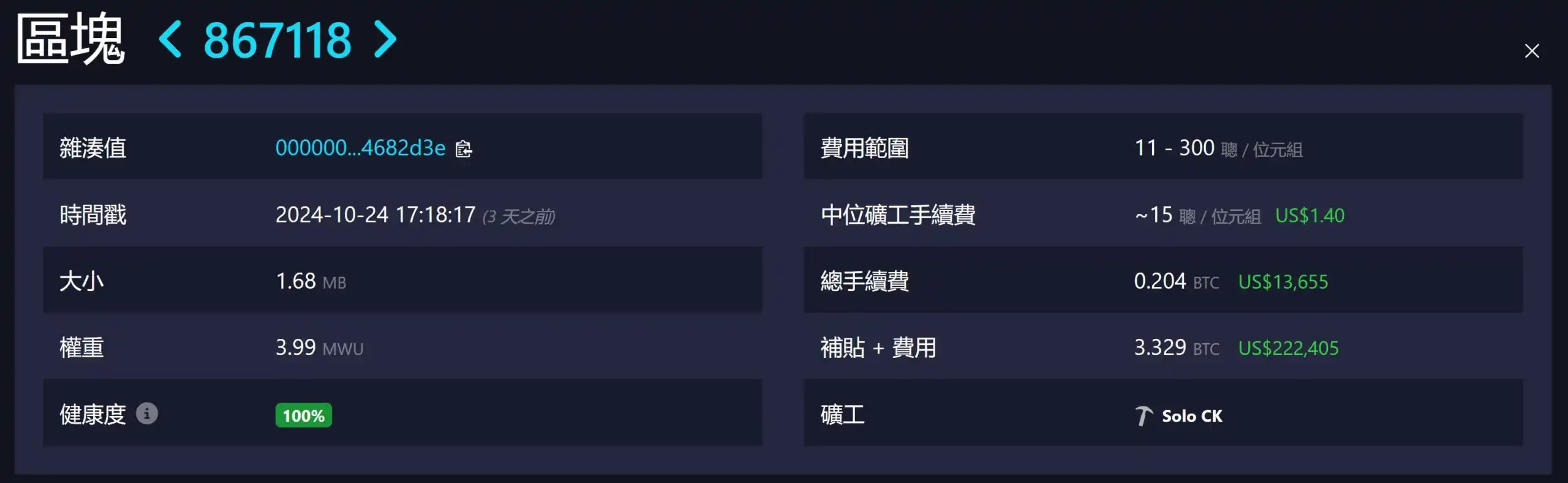据 mempool 数据显示,一名独立矿工透过独立矿池 Solo CKPool 在 24 日 17:18 挖出比特币区块 867118,获得 3.329 枚 BTC(区块奖励+手续费),价值约 22.2 万美元。