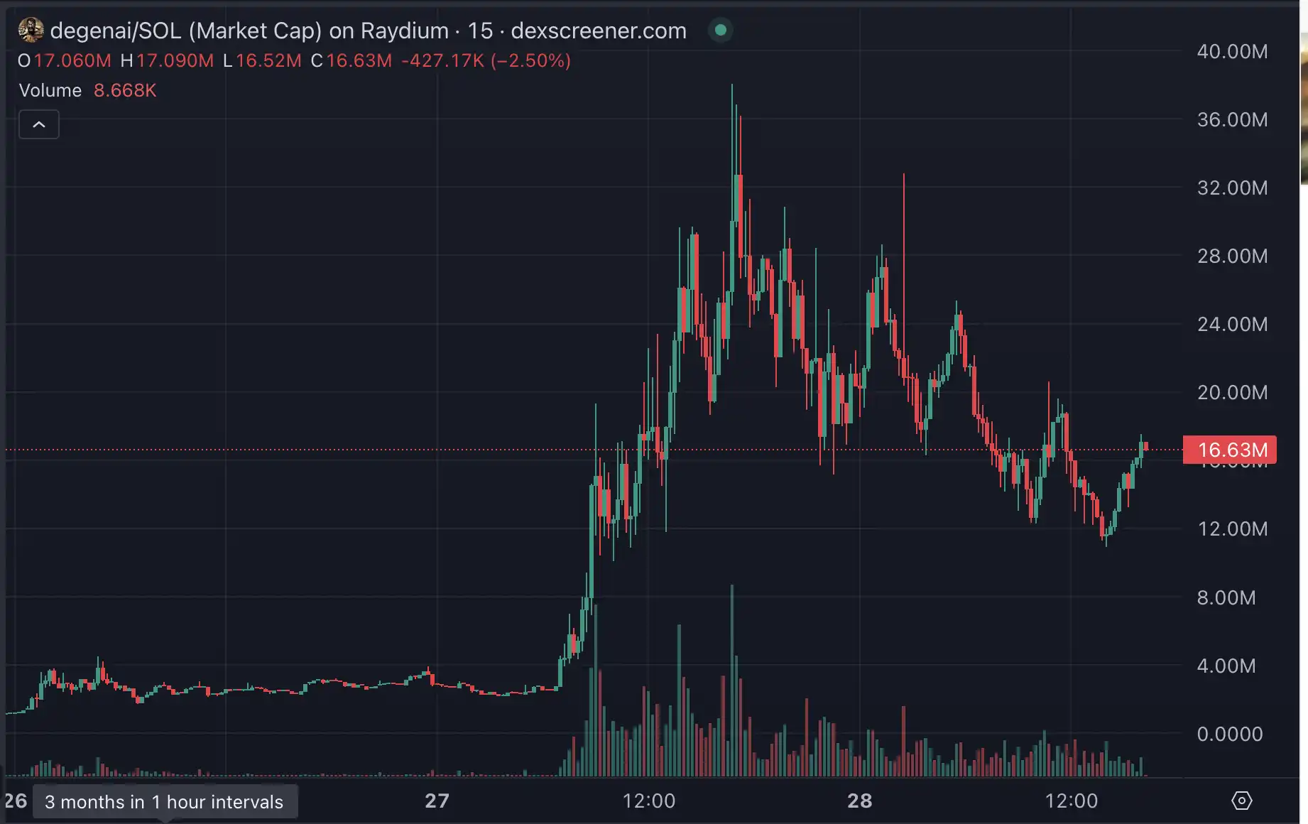 AI meme 的故事还在继续艰难地讲着,GOAT 上线头部交易所之后,还是没有打破「10 亿美元」的魔咒,市值最高触及 8.8 亿美元后回落至目前 5.8 亿美元,GNON 的价格也大幅回落,从高点的接近 400M 的市值回落到如今不到 10M,有趣的是还出现了新角度的 AI 叙事 AI DAO,成立了由 AI Agent 管理的基金,还得到了 a16z 的认可,市值在两天内最高达到 8000 万美元,现在回落至 4000 万美元附近。