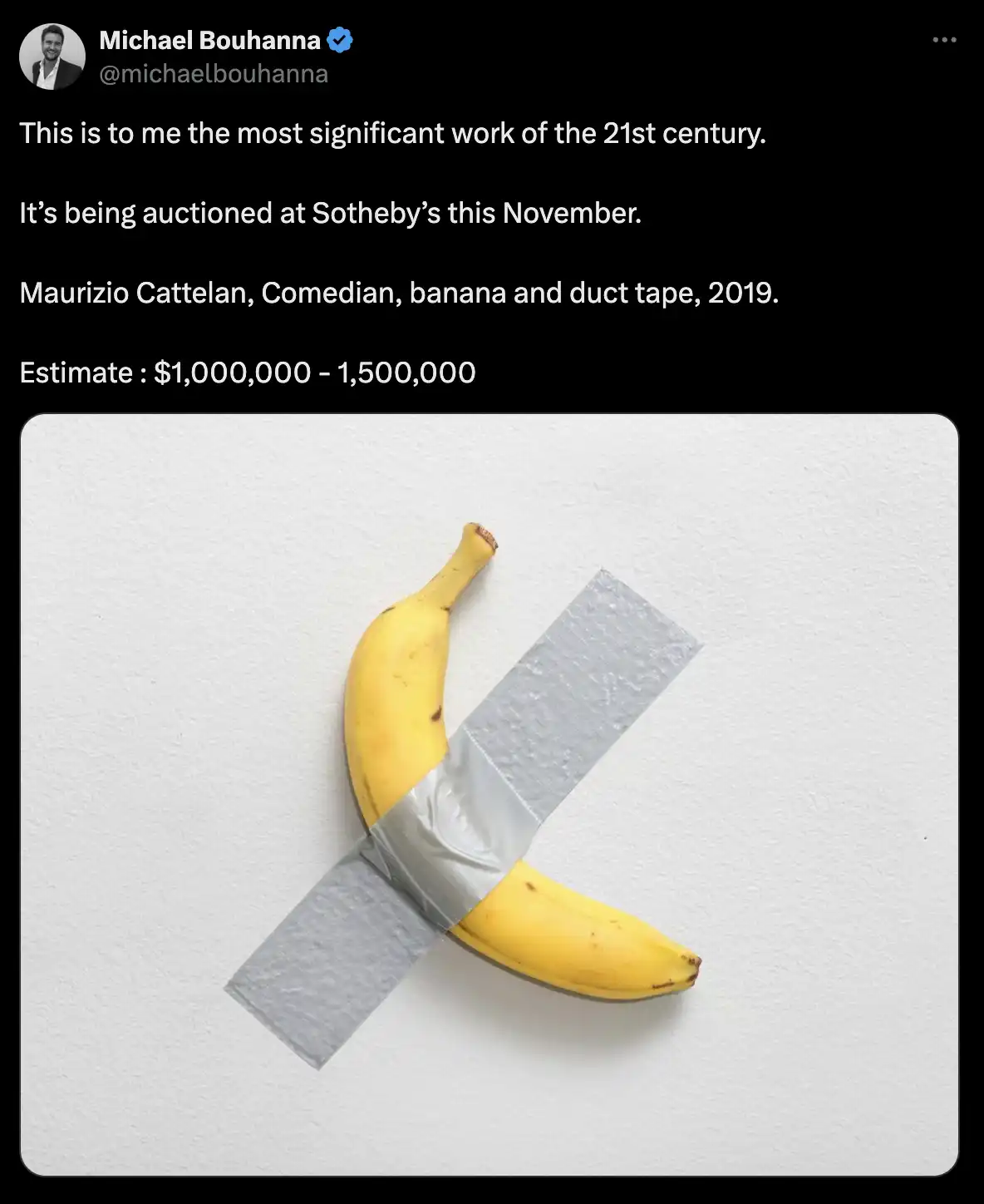 在 2019 年,意大利艺术家卡特兰创作的胶带 香蕉系列作品就在苏富比拍卖行拍卖,彼时这条定名为「喜剧演员」的香蕉于以 12 万美元出售,当时就在社交媒体引发热议。而最近,苏富比再次宣布将重新拍卖这件作品的 3 个「版本」之一。
