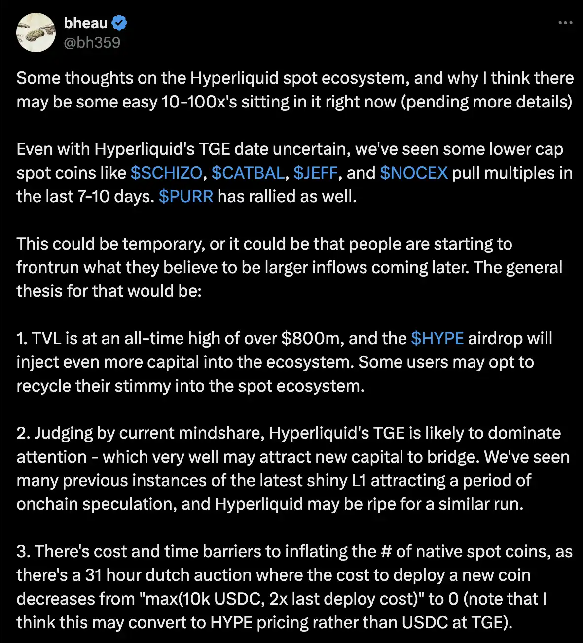 1. 关于 Hyperliquid 和即将 TGE 的 HYPER 代币,@bh359