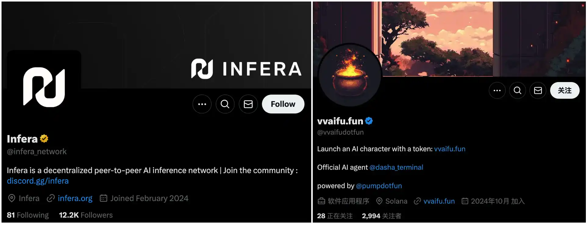 比如在 Solana 上,AI 推理网络 Infera 近期刚刚推出第一个 AI 代理 Kira,其通过 Infera 的 API 在 Llama 8B 上运行,拥有链上交易、自适应学习一级可扩展性和参与度等能力。还有一个 AI 代理代币化发行平台 vvaifu,用户必须持有角色代币才能与其聊天。