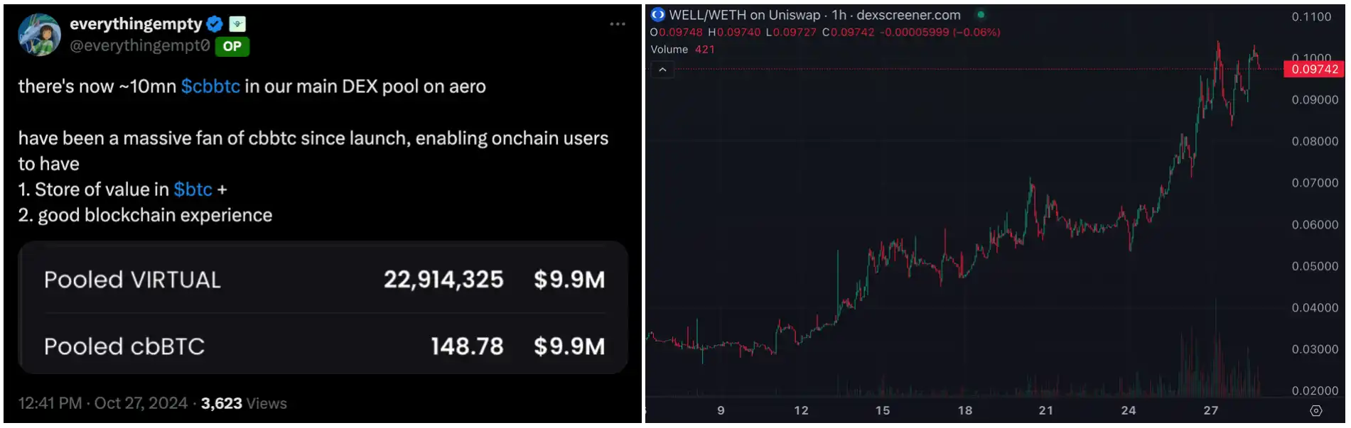 9 月 12 日,Coinbase 官方表示,已正式上线其包装比特币代币 Coinbase Wrapped BTC(cbBTC),在以太坊网络上运行,由 1:1 的比特币作为背书。随着 Coinbase 推出 cbBTC,Base 的链上资产,比如 AERO、WELL、VIRTUAL 等项目实打实地感受到了流动性的注入。
