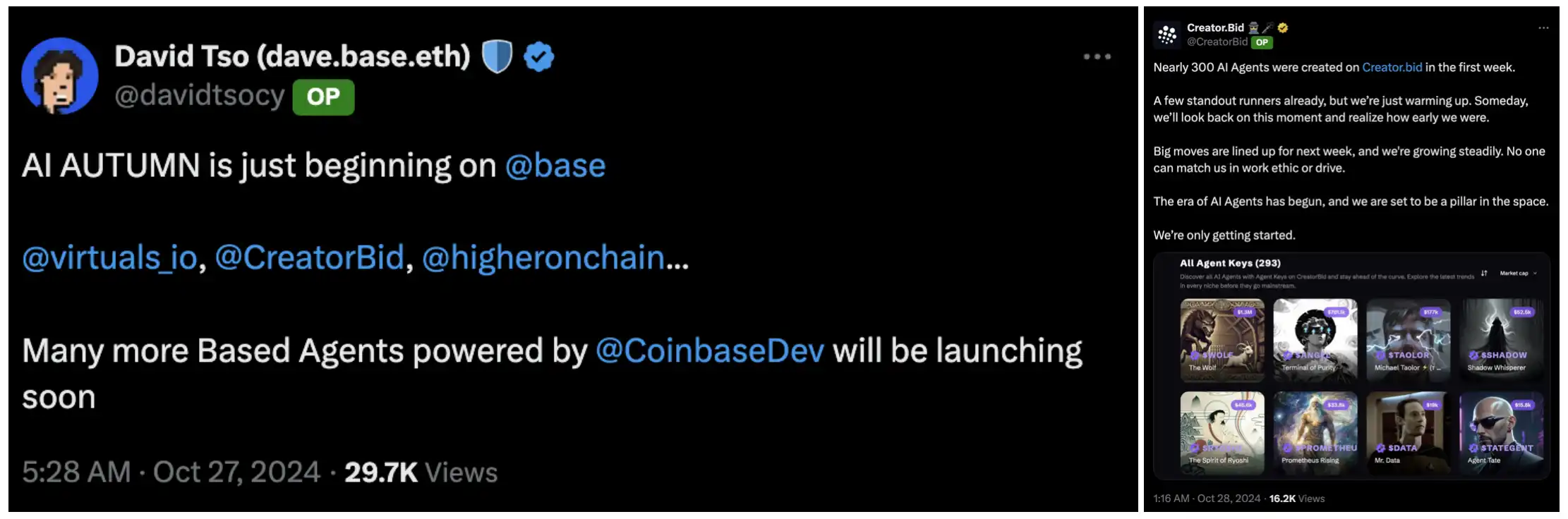 和 Virtual、Higher 一起被 Coinbase 开发者 David Tso 艾特出来的 Base AI Agent 项目还有一个 Creator.Bid。目前已经建立了 328 个 AI Agent,官方称将于下周发布重要通知。