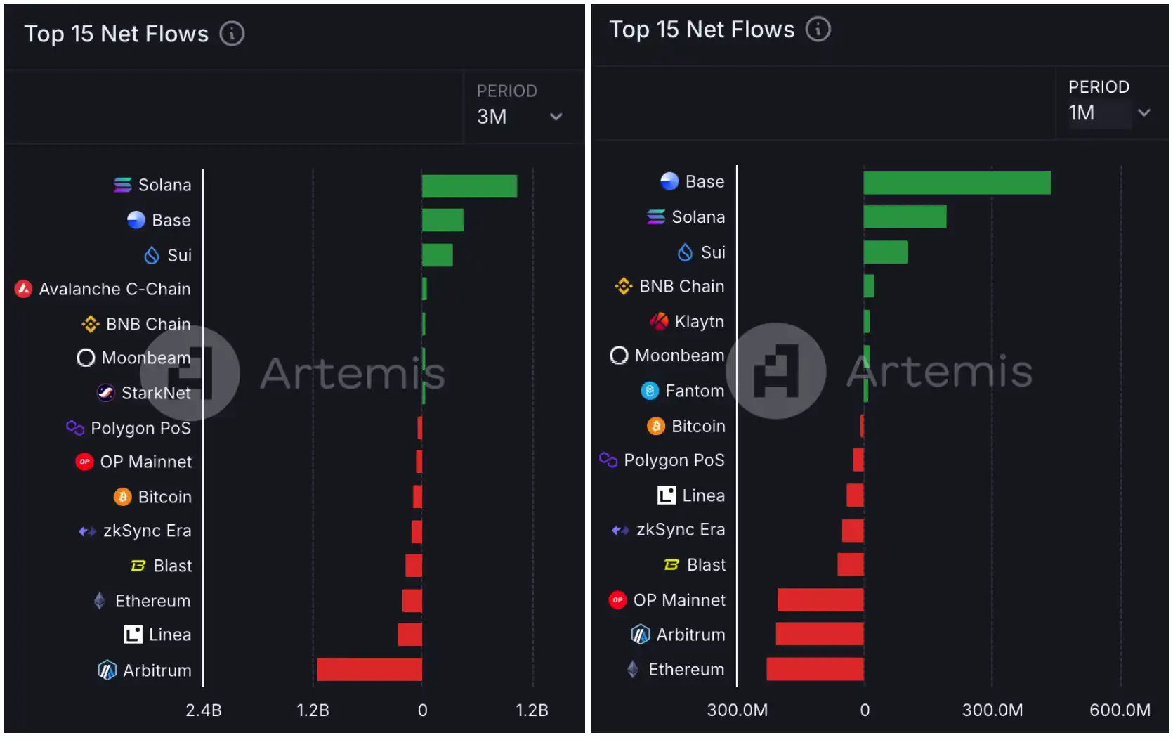 据 Artemis 数据,过去三个月,资金流入最多的链是 Solana,达 16 亿美元,但最近一个月,却是 Base 流入最大,达 2.53 亿美元。也就是说,过去一个月资金增速超过 Solana 成为第一。