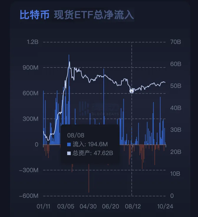 律动 BlockBeats 一直在记录 ETF 的流入情况,数据图表能直观的看到,8 月 8 日就是阶段的最低点,这几个月资金一直在净流入。