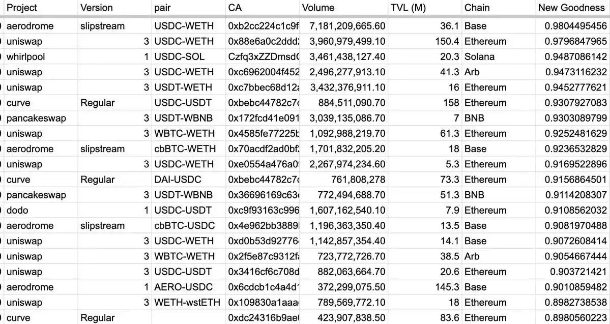 最后,我对每个池的交易量和总锁仓量 (TVL) 进行了加权,以符合另外两个标准。