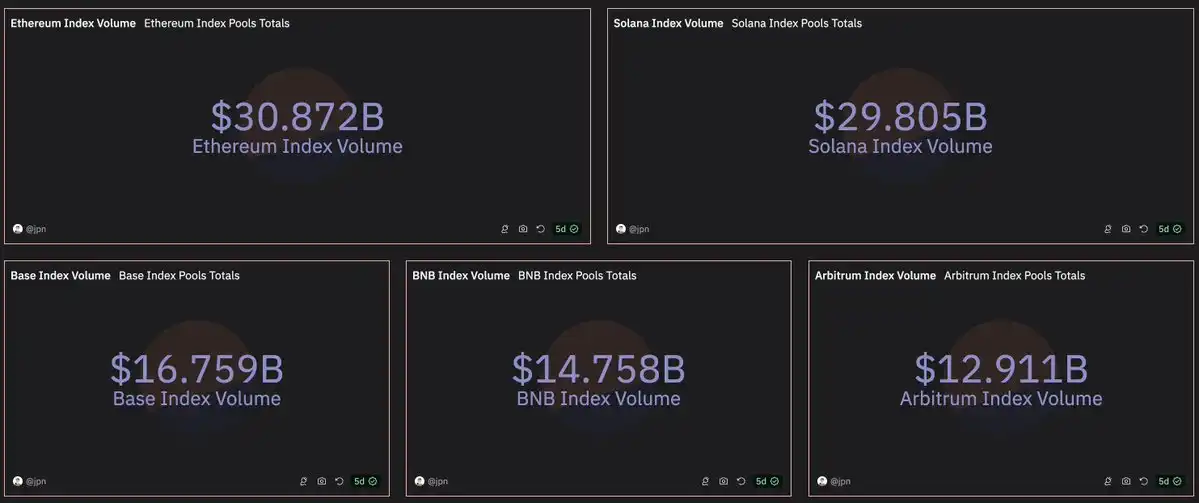 我收集了 Ethereum、Solana、BSC、@arbitrum 和 @base 上所有流动性池的交易量数据,并统计了过去 30 天的总交易量。