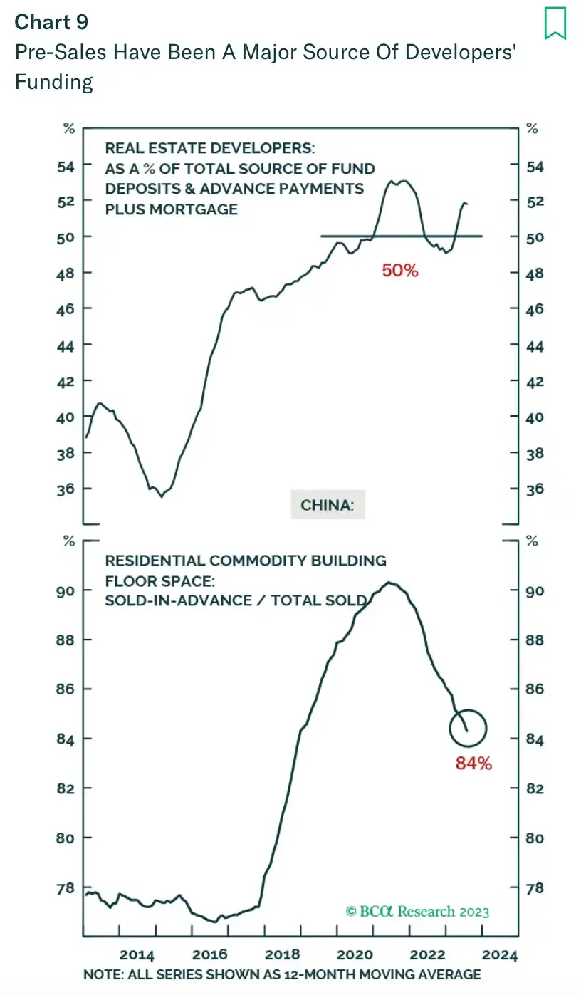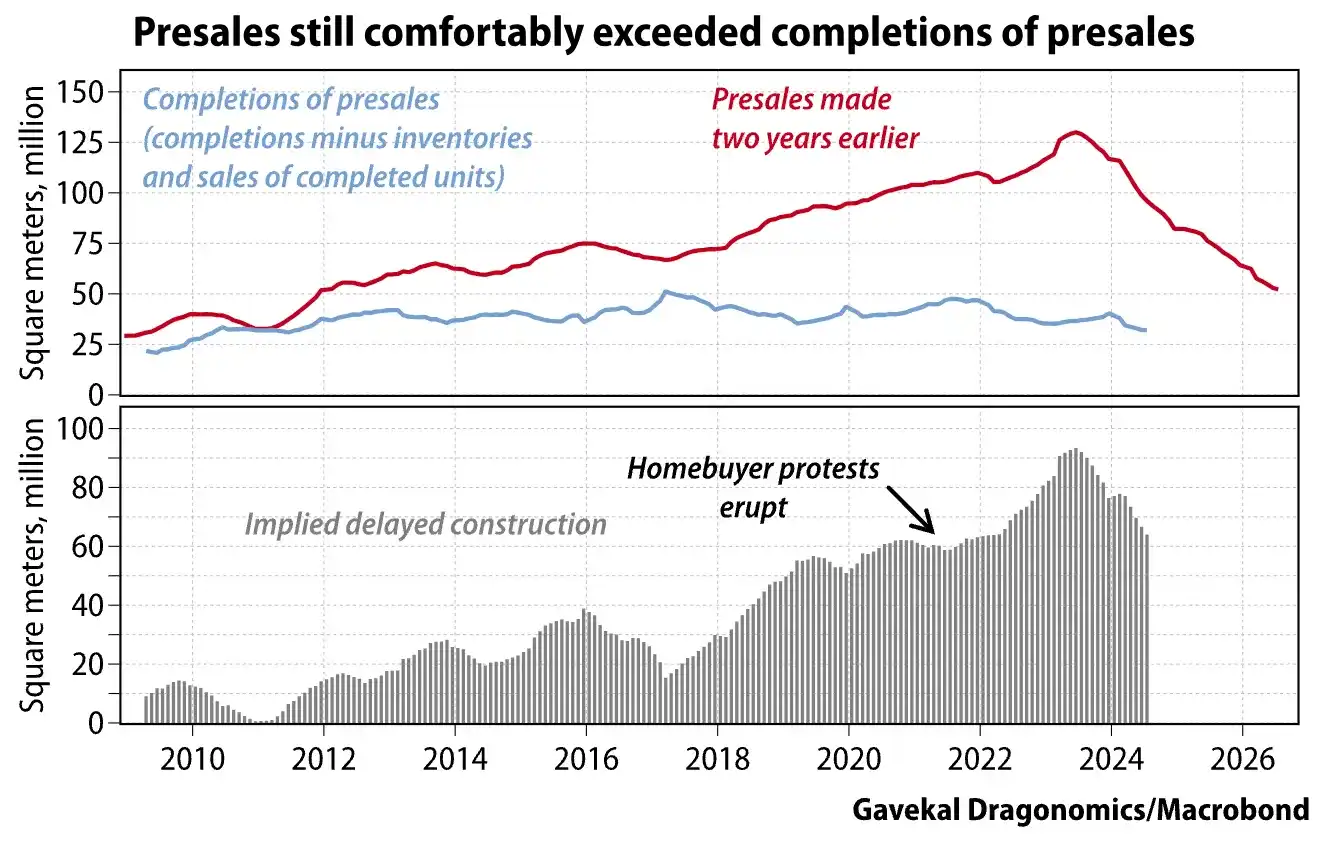 在我继续讲述故事的时间线之前,我想快速提及中国房地产市场一个不太为人所知的特点及其对政策措施成功结束危机的影响。在中国,大多数公寓是在尚未建成之前就被购得。购房者需要先支付现金定金,然后在房地产完成前的几年内提供剩余款项。