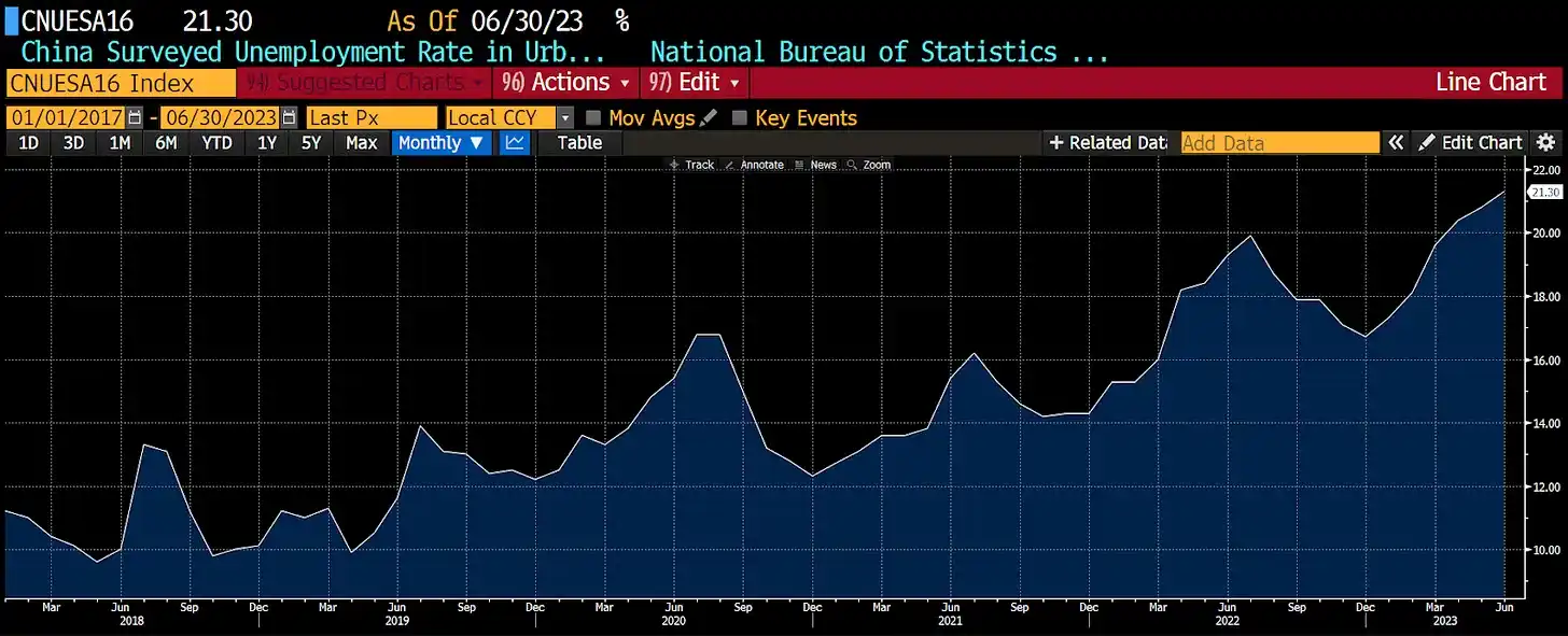 在经济活动因过剩产能的通缩性清算而收缩时,北京真正面临的问题是大量失业的年轻人。由于城市青年失业率过高,中国自去年 6 月起便停止发布该数据。