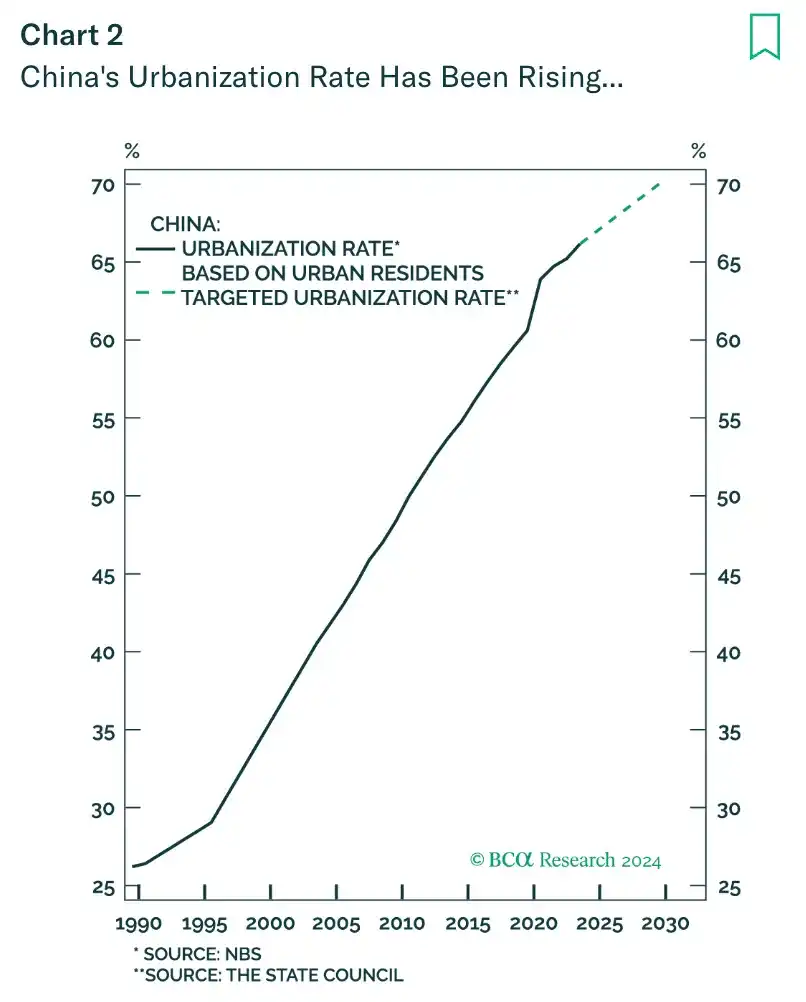 毛主席开启了中国城市化的进程,随后邓小平及其更加市场化的政策将城市化推向了高速发展。党认为,重塑中国(字面意思是「中央王国」)在全球的主导地位,唯一的途径是依靠全球制造业的实力。这意味着将农民从农村迁移到城市,以制造出口商品。因此,每个五年计划都有城市化的目标。
