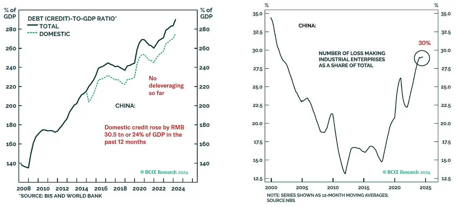 中国政府已经实施了大规模的财政和货币刺激措施,然而,由于经济的巨大过剩,这些资金仅仅是用来维持基本运转。左侧图表显示了不断上升的债务占 GDP 比例,这使得「僵尸」国有企业得以维持运营(右侧图表),避免了大规模裁员。