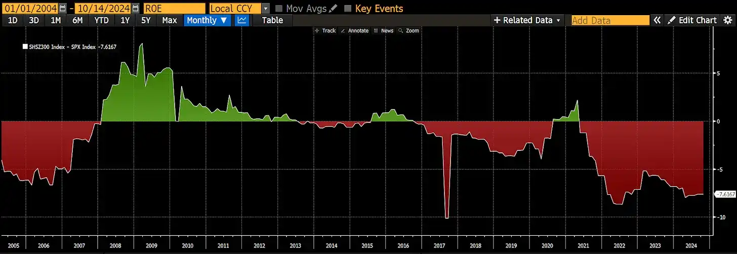 这张图表显示了 CSI300 指数的股本回报率(ROE)与标普 500 指数的股本回报率之差。可以看出,中国股票的表现明显逊色于美国股票。
