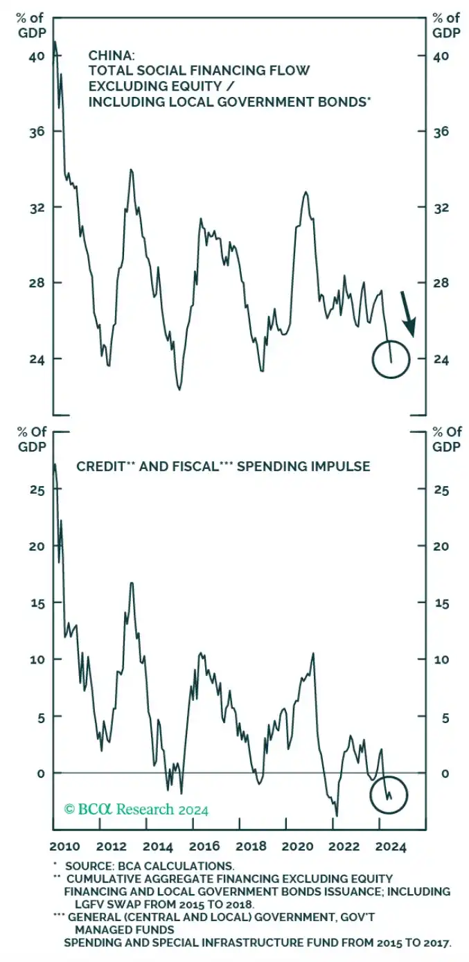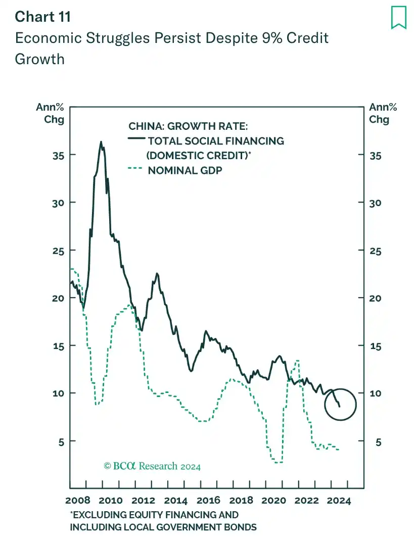 中国的广义货币增速已降至历史最低水平,导致名义 GDP 增长大幅放缓。