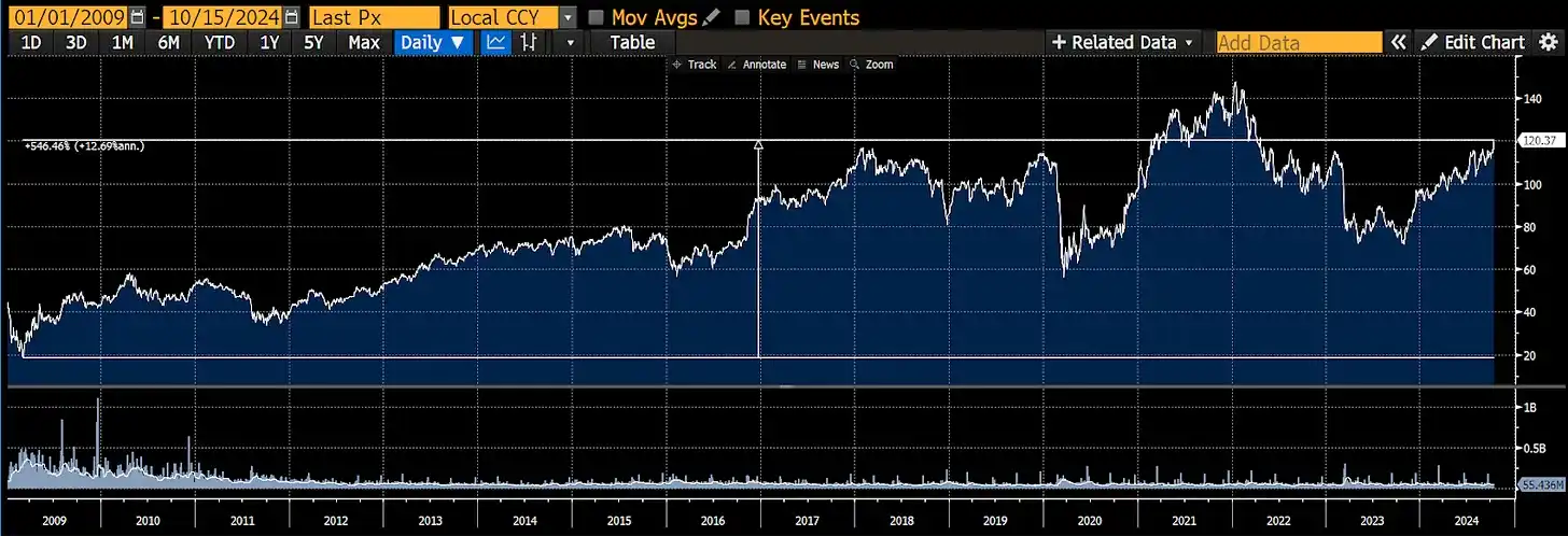 这是 KBW 银行指数,涵盖了美国上市的主要商业银行。从 2009 年 3 月全球金融危机后的低点起,该指数上涨了超过 500%。