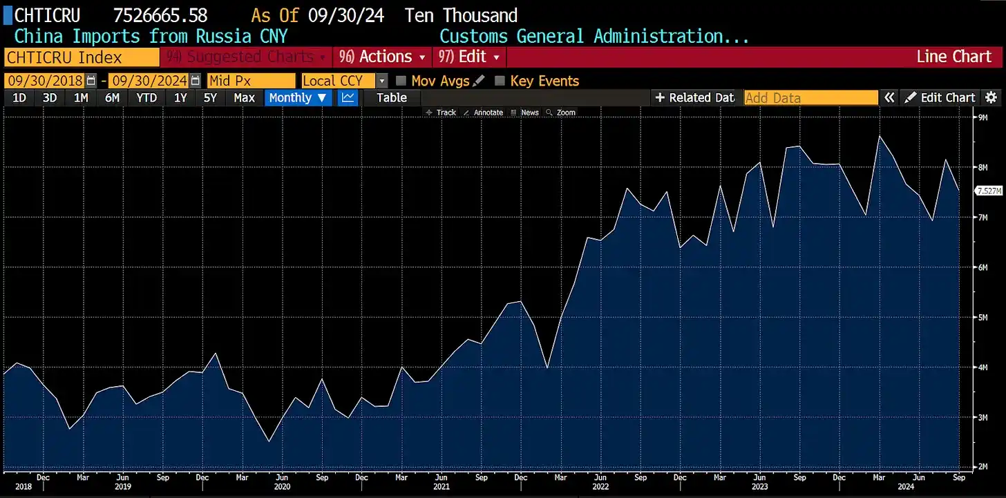 在 2022 年 2 月乌克兰战争爆发后,西方冻结了俄罗斯的美元和欧元储备并对其实施制裁。在此之前,中国还无法在贸易条件上占据主导地位。但如今俄罗斯别无选择,只能在中国的要求下以人民币进行支付,并向中国以折扣价格供应能源。