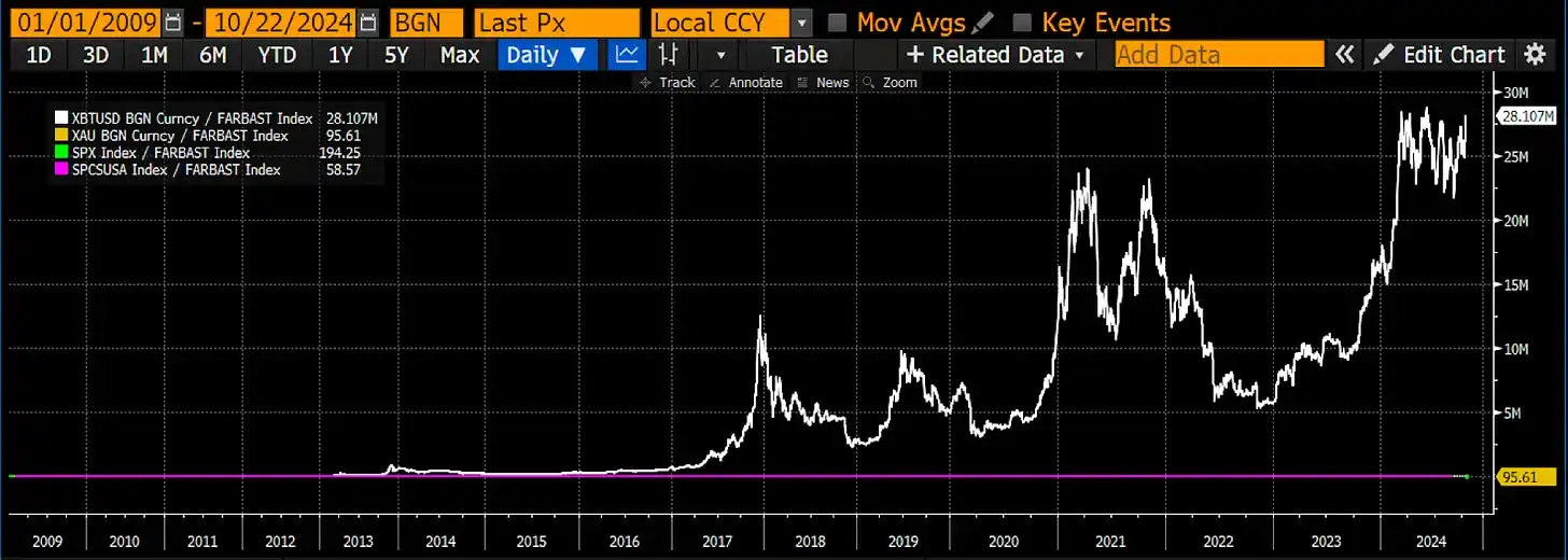 正如我之前所说,这是我最喜欢的图表。没有其他主要风险资产类别能像比特币一样有效抵御货币贬值。投资者本能地意识到这一点,因此在思考如何保护储蓄的购买力时,比特币将如命运般直视着你,犹如科维萨茨·哈德拉克(Kwisatz Haderach)般不可忽视。