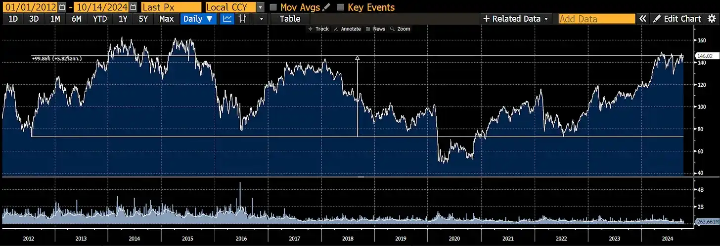 这是欧元斯托克银行指数,包含了欧洲主要银行。从 2011 年危机后的低点起,该指数仅上涨了 100%。企业社会主义在美国的盈利能力和普及程度远超欧洲,不论政治评论员们如何分析。记住孩子们,私有化的收益与社会化的损失,就是丰厚奖金的配方。