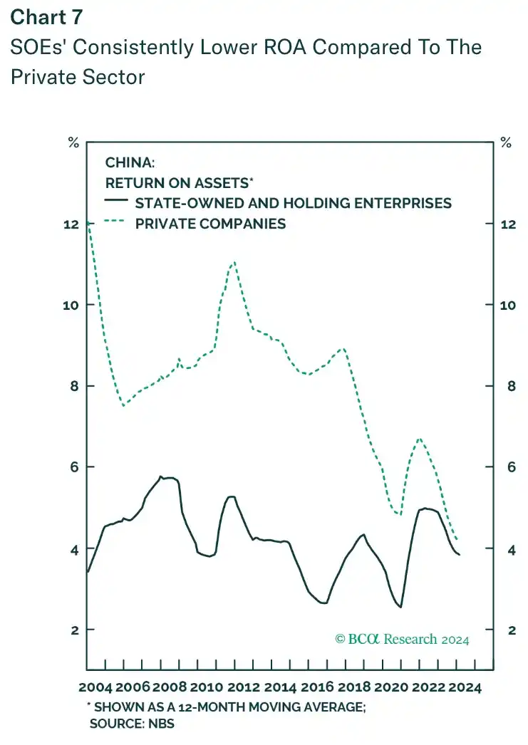 然而,股市存在问题:表现最好的公司往往是国有企业。国企获得最便宜的银行信贷,并因专属经营许可证得以在电信、石油天然气、矿产等高利润行业中进行垄断性经营。您可能会认为这意味着国企的股票表现十分出色,但实际上国企的股本回报率(ROE)表现平平。这是因为所有国企的高层都是党员,党的利益和股东利益并不总是一致,而且党的需求始终优先。