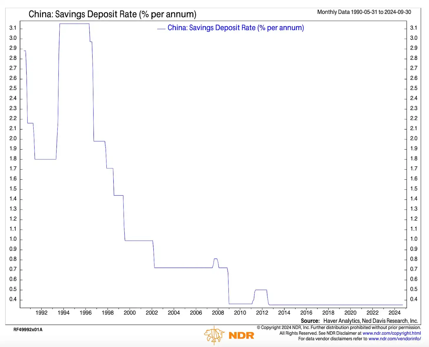 正如您所见,贷款基准利率始终低于工业生产增加值,这是因为国有银行对普通储户提供的存款利率非常低——请参见下图。