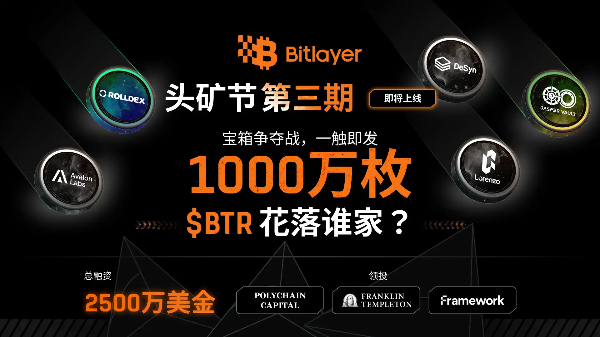 10 月 29 日,Bitlayer 正式上线了头矿节 3 期活动,这期活动由官方与 RollDex、Jasper Vault、DeSyn Protocol、Avalon Labs 和 Lorenzo Protocol 五个生态项目联合发起,主题为「宝箱争夺战」,为用户提供了总量 1000 万枚 BTR 代币、生态项目空投以及 Bitlayer 生态联合勋章奖励等多重奖励。