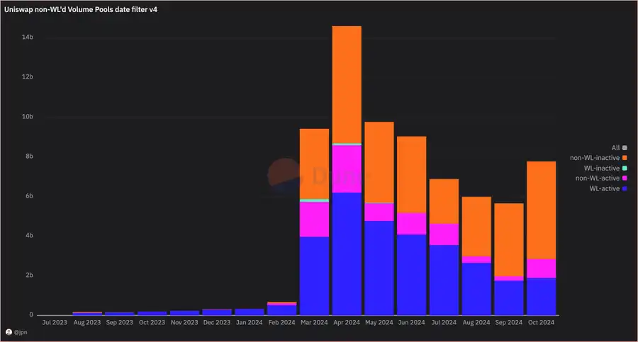 橙色部分代表过去两天内没有交易的资金池的交易量(即 Rug 代币/资金池),仅在 10 月,这部分交易量就接近 50 亿美元,达到了自 4 月以来的最高水平。
