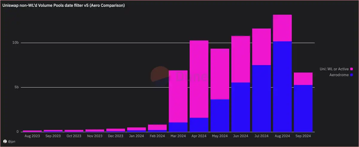 jpn memelord 转向 AerodromeFi 及其白名单流程,试图将其作为过滤 Uniswap 在 Base 上交易量的可能方法。在 Aerodrome 上,若资金池要获得激励,其代币需通过 Aerodrome 团队的白名单审核,这有助于将优质项目的交易量与其他项目区分开来。