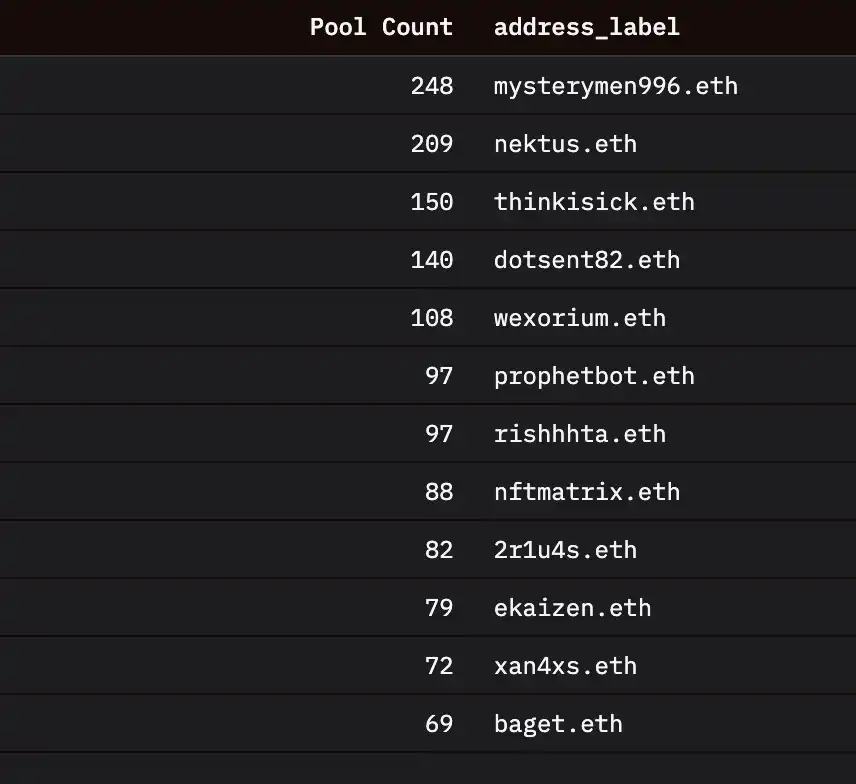 他尝试仅关注由 ENS 用户创建的资金池。这一方法更具成效,仅有 1.7 万个资金池是由拥有 ENS 的地址创建的,这一数字远低于资金池总数,并可能有效地排除了大多数由机器人创建的资金池。