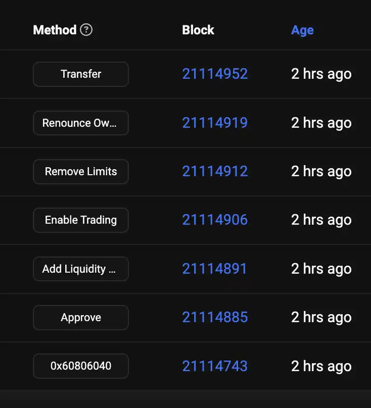 他们的操作开始于部署一个代币,奇怪的是,采用了非标准的 9 位小数,并将大部分流动性添加到 Uniswap v2 池中。随后,他们开启交易,放弃合约的所有权,并销毁流动性代币,这一系列操作看起来像是一个合规的设置。