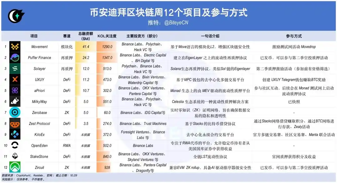 Binance 区块链周近期公布了 12 个前瞻性的项目,这些项目在模块化、再质押、DeFi、Layer 2 等领域展现出潜力与创新,届时将在会上进行宣传。