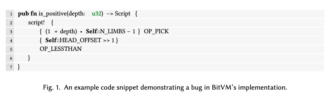 首先,BitVM 的设计中包含了大量堆栈操作和寄存器计算,这些操作需要在比特币的非图灵完备脚本中高效地实现和验证。例如,为确保合约执行时能够正确判断数值的正负,一个常用函数是 is_positive,它通过检查数值的最高位判断正负。然而在一个早期版本中,is_positive 函数因为计算偏差而错误地将 0 判定为正数,这种细微的错误可能导致合约执行的严重偏差,甚至引发潜在的经济损失。