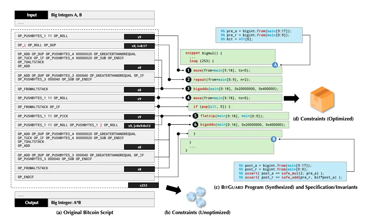 通过形式化验证(Formal Verification),Nubit 的工具能够在代码部署之前自动检查类似的计算逻辑,确保所有执行路径都符合预期。在这里,Nubit 团队设计了一种基于寄存器的 DSL(领域特定语言),将比特币脚本复杂的堆栈操作转化为更易于验证的寄存器操作,从而简化了开发和验证流程。此外,针对多次重复的循环式计算,该 DSL 引入了「循环不变量」,以有效地减少代码中的重复计算,降低验证难度。