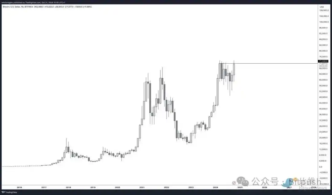 从本月整体表现来看,比特币在 10 月 10 日闪崩至 58,855 美元的低点,但随后开启了一轮反弹,上涨至接近历史高点的位置,目前的 30 天涨幅约合 16.08%。根据市场分析师 Nagato 的说法,本月的收盘价低于 71,400 美元将意味着「失败」。