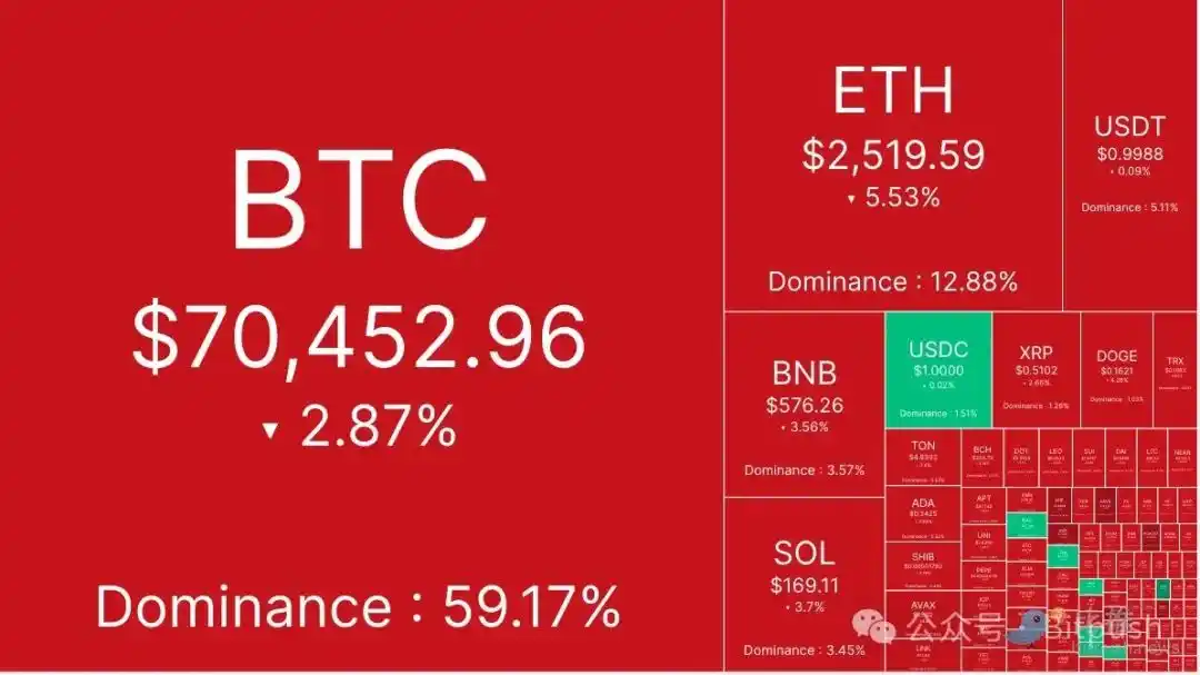比推数据显示,比特币在午盘附近跌破 72,000 美元的支撑位,随后跌落 70,000 美元以下,截至发稿时,比特币交易价格为 70,452 美元,24 小时跌幅近 3%。