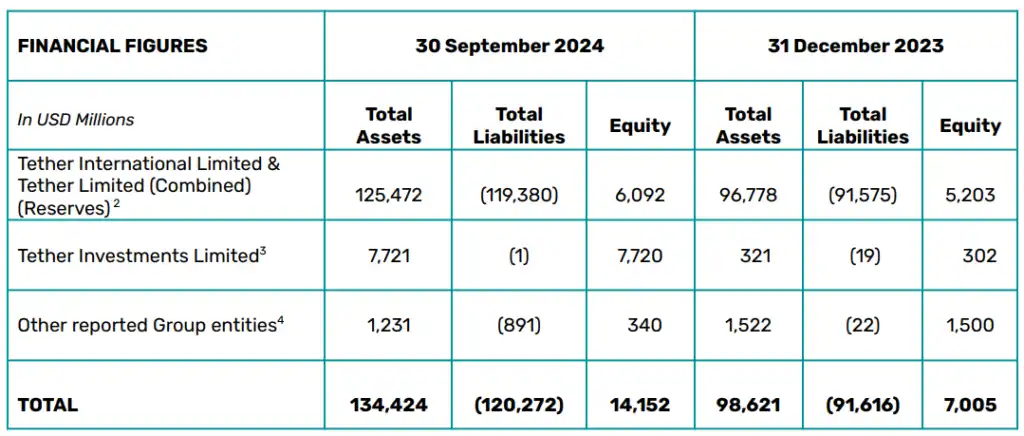 美元稳定币 USDT 发行商 Tether 今日公布由全球前五大独立公共会计师事务所 BDO 所审核的 2024 年第 3 季储备报告显示,其当季净利润达 25 亿美元,今年前九个月累计利润达 77 亿美元,集团股本达到 142 亿美元,总资产达 1,344 亿美元,均创下历史新高。