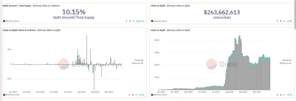 此外,Bybit 作为 Ethena 的投资方和重要合作平台,不但支持 USDE 作为保证金进行衍生品交易,还为存放在 Bybit 的 USDE 提供一度高达 20% 的收益率(9 月降低至最高 10%)。因此 Bybit 也是 USDE 最大的托管方之一,目前拥有 2.63 亿的 USDE(高峰时期超过 4 亿)。
