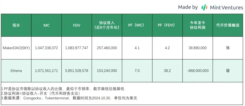 因此,我们将用目前流通市值最大的稳定币项目 MakerDAO(现 SKY)作为估值对标物来进行比较。