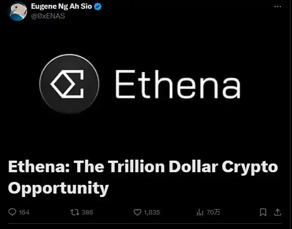实际上,真正推动这轮 ENA 价格起飞的是知名交易员和加密 KOL Eugene @0xENAS 在 10 月 12 日发表的对 Ethena 的大力喊单文章:《Ethena: The Trillion Dollar Crypto Opportunity》。