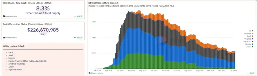 USDE 不但在以太坊主网上进行发行,还在多条 L2 和 L1 上进行拓展,目前在其他链上发行的 USDE 规模为 2.26 亿,约占总量的 8.3%。