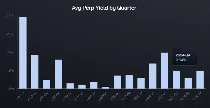 ETH 的永续合约套利年化收益率整体也与 BTC 类似,目前已经回到了 8% 的位置。