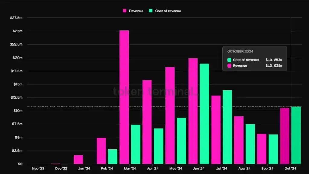 也就是说,与大家印象中的「Ethena 很赚钱」不同,实际上 Ethena 的收入在扣除了财务和营销开支后,今年截至到 10 月底,它的净亏损已经高达 8.68 亿美金。此处笔者尚未考虑 9-10 月 ENA 代币支出,因此实际亏损金额可能会比这个数值更高。