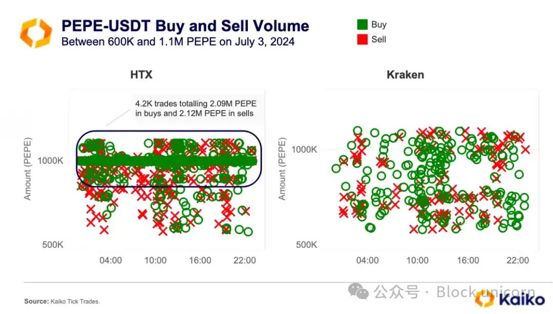 进一步分析交易数据显示,在 HTX 上的 PEPE-USDT 市场中有算法交易活跃。7 月 3 日内,有 4200 笔 1M PEPE 的买卖订单,每小时平均约 180 笔。这种交易模式与 Kraken 同期的交易形成鲜明对比,后者的交易更显自然且偏向零售驱动,交易规模和时间均不规则。