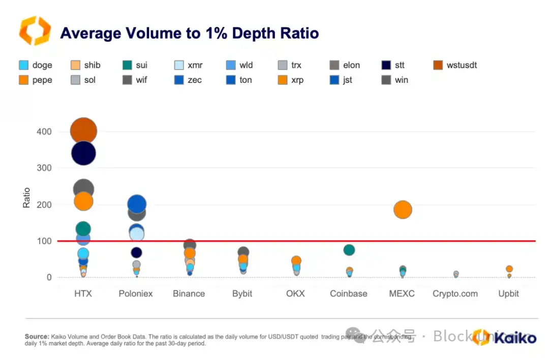 数据显示,HTX 和 Poloniex 上具有超过 100 倍交易量-流动性比的资产最多。通常 meme 币、隐私币和小市值的山寨币显示出异常高的交易量-深度比。