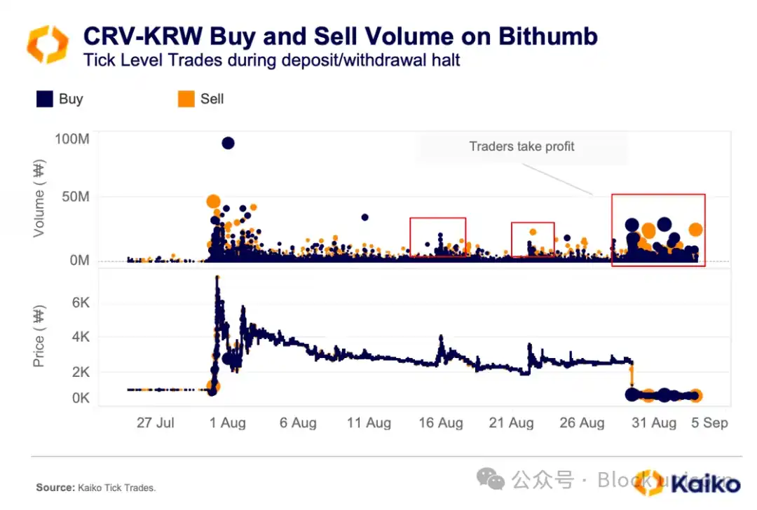 图表显示,当 Bithumb 暂停 CRV 代币的充值和提现时,大量买单推动价格大幅上升,但随后随着抛售开始迅速回落。在暂停期间,多次因买入而导致的短暂涨价都紧接着出现了抛售。总体来看,抛售量明显高于买入量。