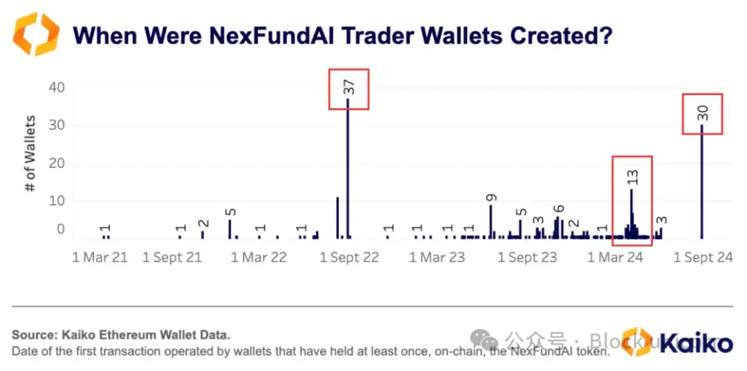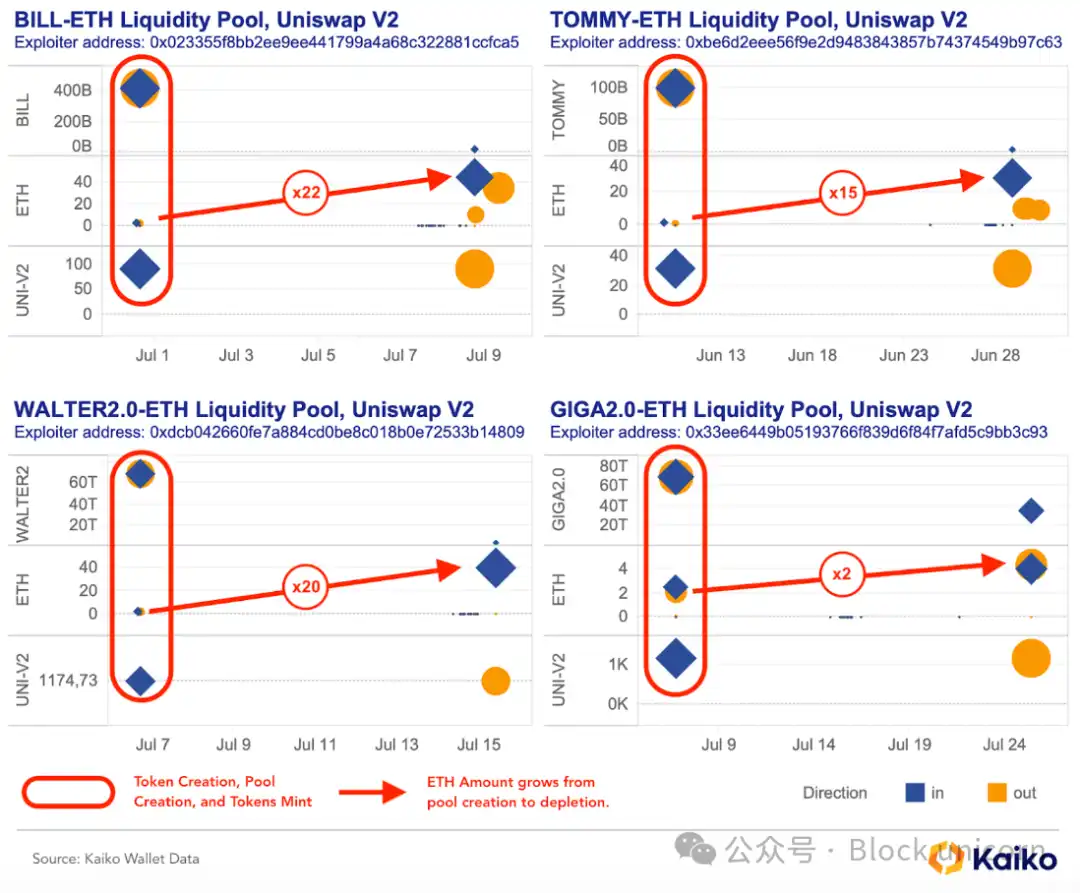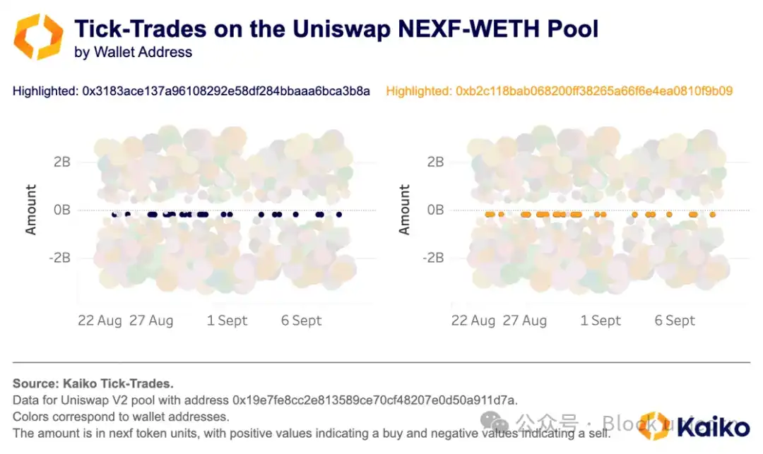 一些在以太坊上发行代币的发行人会在 Uniswap 上建立短期流动性池。通过控制池内的流动性,并使用多个钱包进行刷单交易,他们增强了池子的吸引力,吸引普通投资者入场,从而积累 ETH,并抛售手中代币。根据 Kaiko 的 Wallet Data 显示,对四种加密货币的分析表明,这种操作可在大约 10 天内实现初始 ETH 投资的 22 倍回报。这一分析揭示了代币发行人中广泛存在的欺诈行为,已超出 FBI 对 NexFundAI 的调查范围。