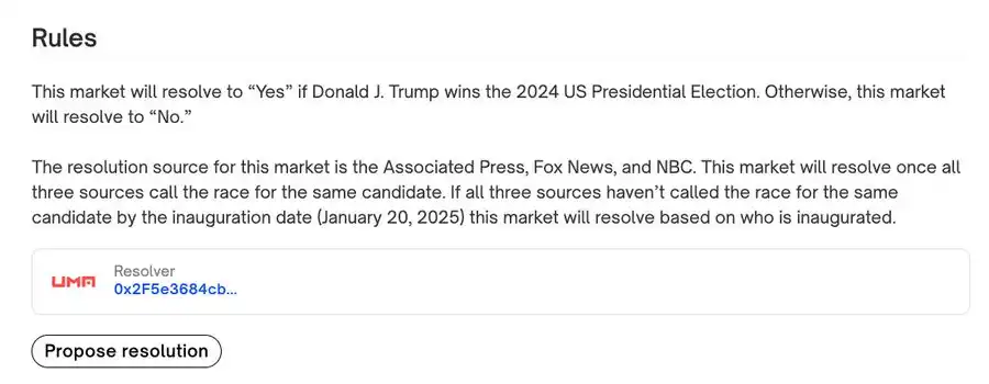 根据规则:所有新闻机构都需确认选举结果。基于 Polymarket 的过往争议先例(即以往争议市场的结果),我预测市场将进入「双重争议」阶段,并且 UMA 代币的大户(UMA 投票者)最终会将结果定为「特朗普败选」。