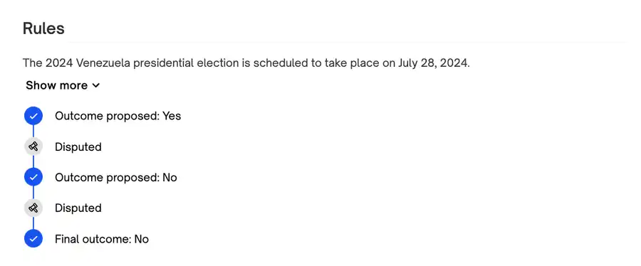 任何人都可以在市场解决后的大约一天内,对结果提出争议,只需在 UMAprotocol 上质押 750 美元。这对于平台上的流动性来说只是九牛一毛,交易者在市场最终解决之前最多可以提出两次争议。