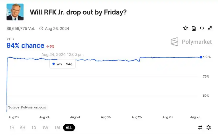 最近一个「RFK 将在周五退出」的市场在解决后争议期间,YES 一度跌至 96%。熟悉 Polymarket 争议机制的资深玩家(OGs)借此获得了 6% 的套利机会,这一机会是市场规则内涵之一。